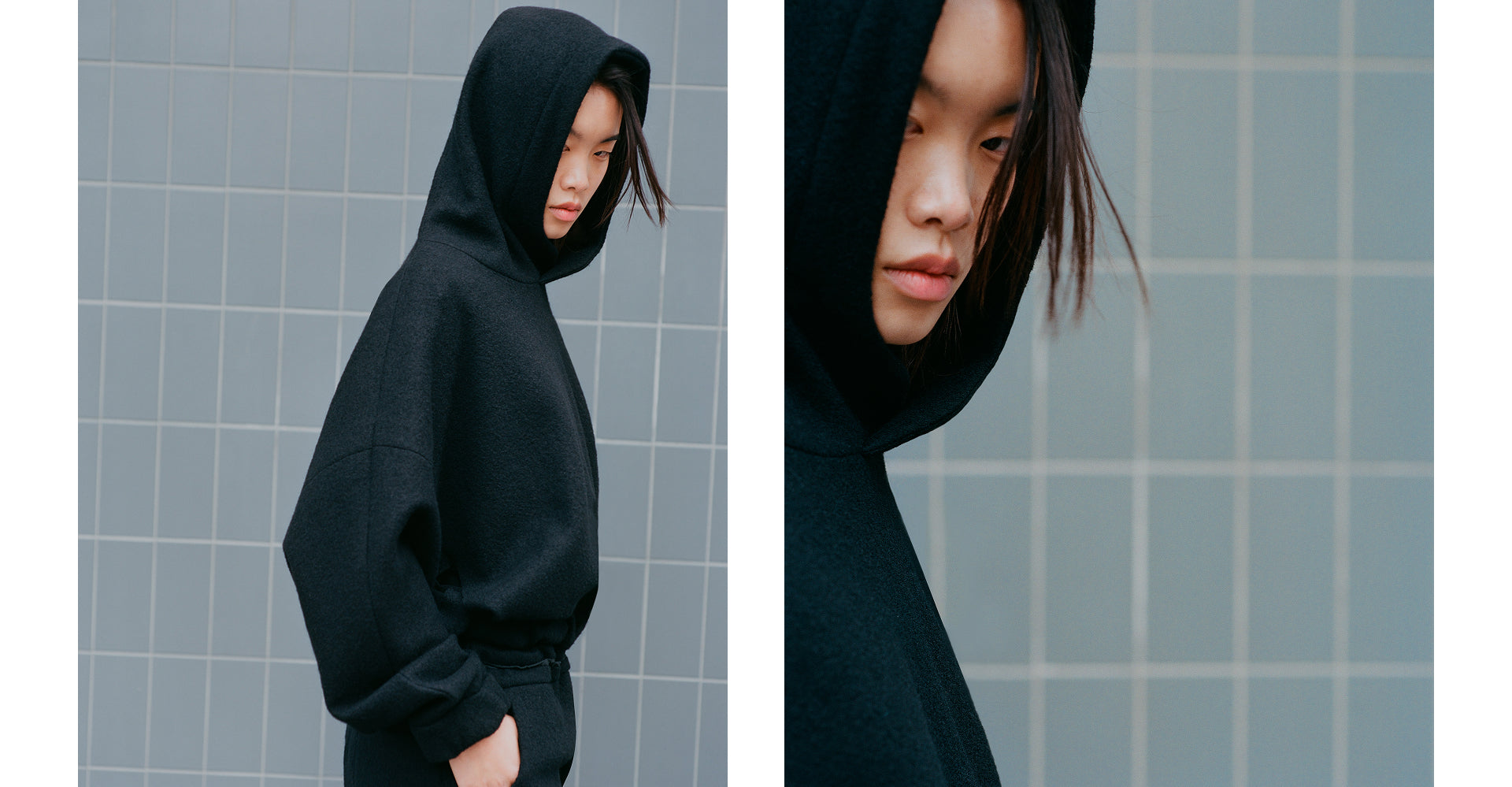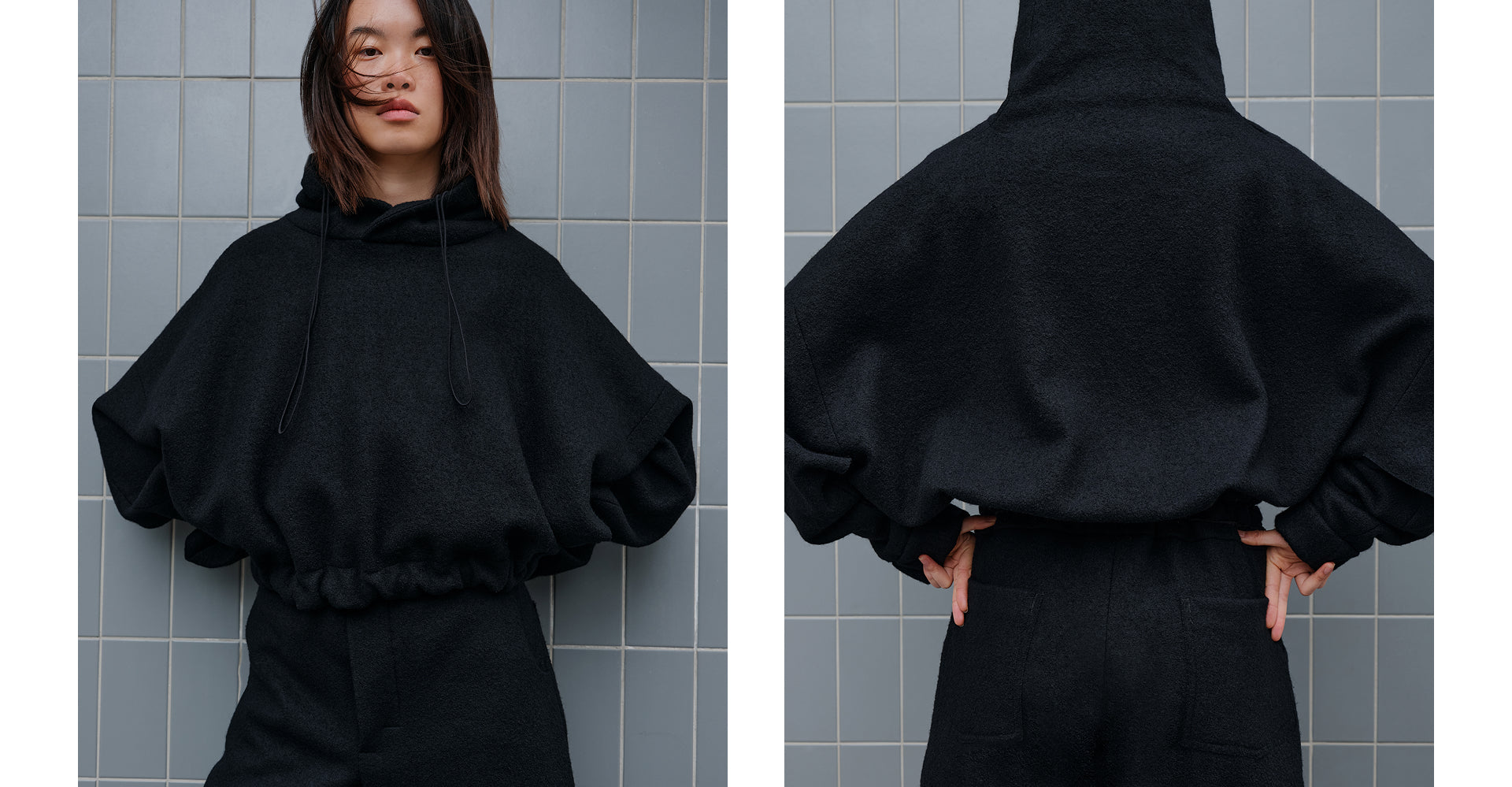 We take the ideas and grow with them to implement a stronger visual aesthetic relating to the design language of avant-garde sportswear. Again, as with ONE, we see three varied pieces. Moving into the colder months, we want to engage with warmth and comfort whilst not losing that overall feeling of elegance. Therefore, we have created a matching hooded sweatshirt and trouser combination in an Italian boiled wool. It has a beautiful hand feel whilst retaining great warmth for the wearer. Silk is placed against this fabric, continuing the juxtaposition of texture, weight, and visuals we hold so dear.