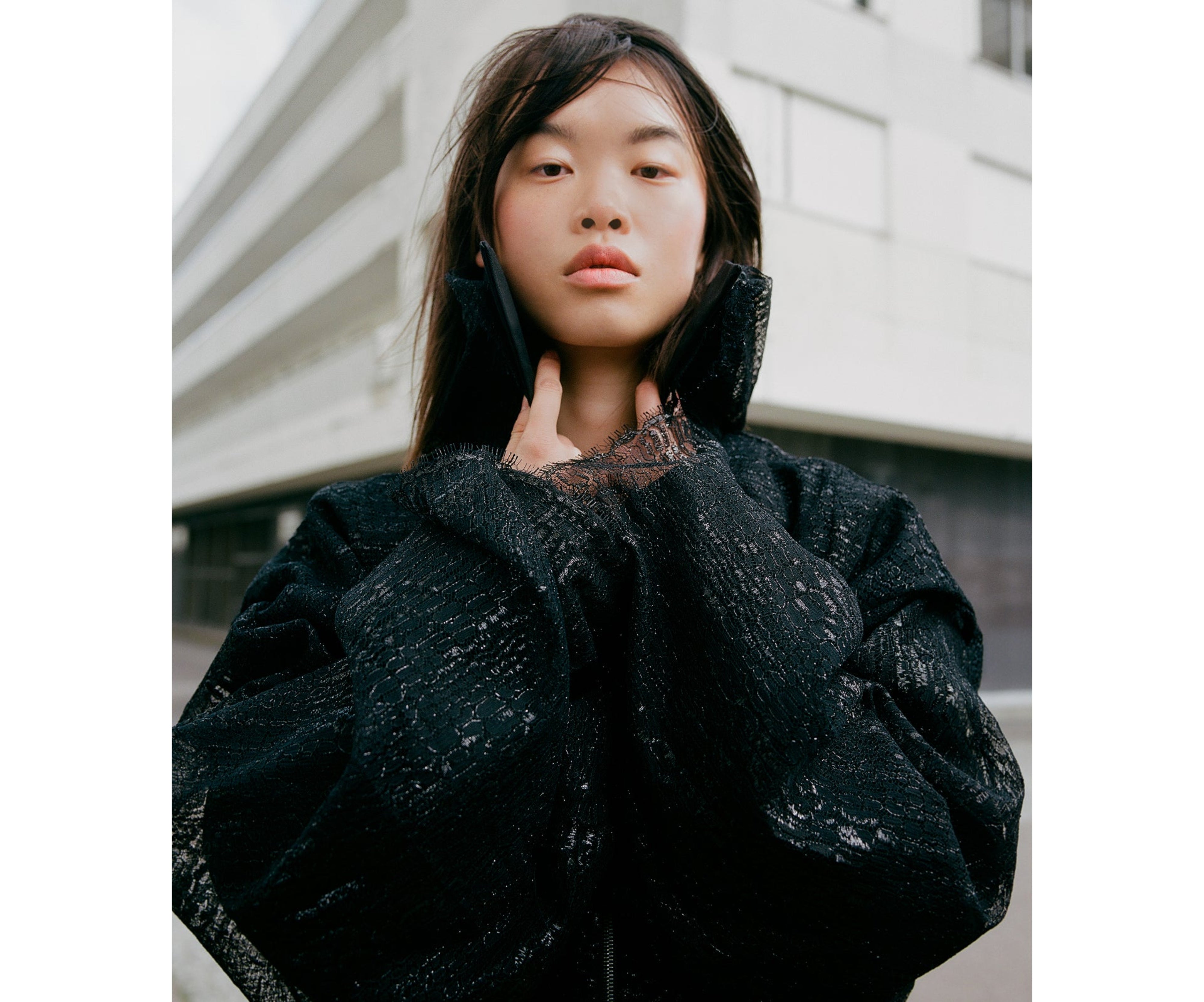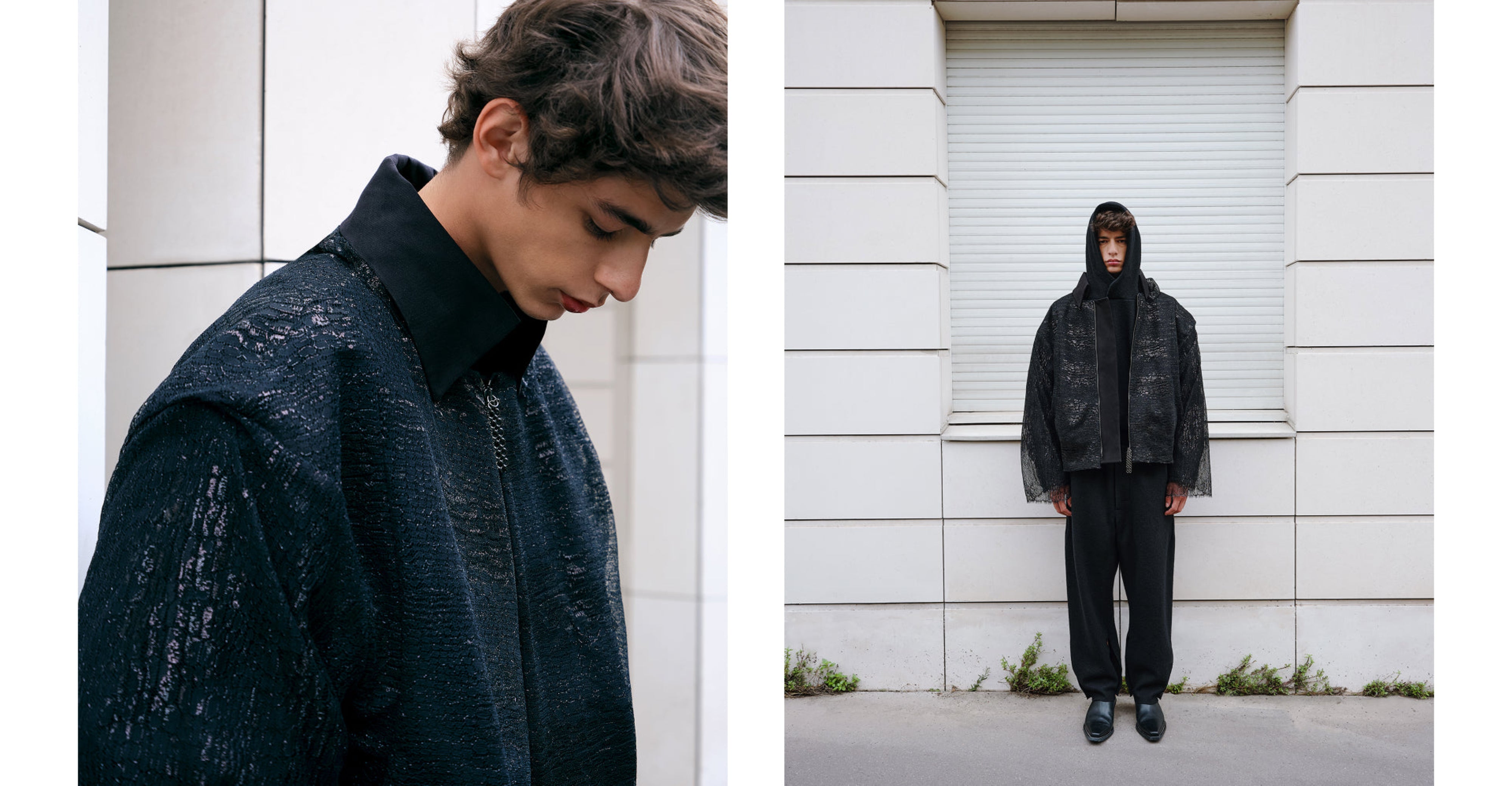Moving into the next phase, we have a canvas outerwear piece covered in delicate lace. Exploring tactility and texture, we push it further with this garment—merging the two worlds of masculinity and femininity via fabrications and speaking to a garment for all.